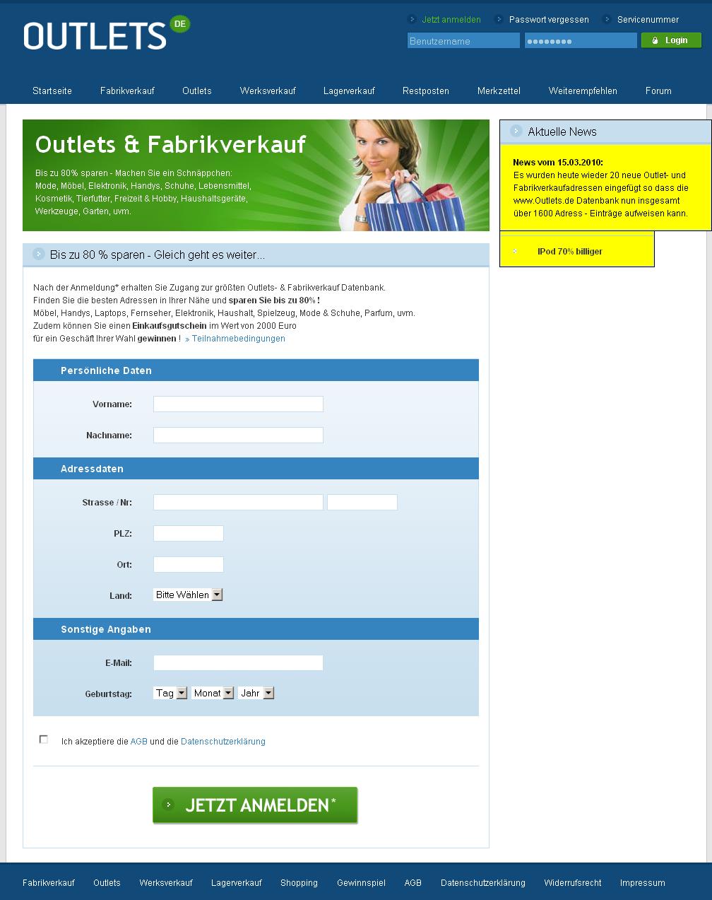 auf der Internetseite www.outlets.de in der hierfür vorgesehenen